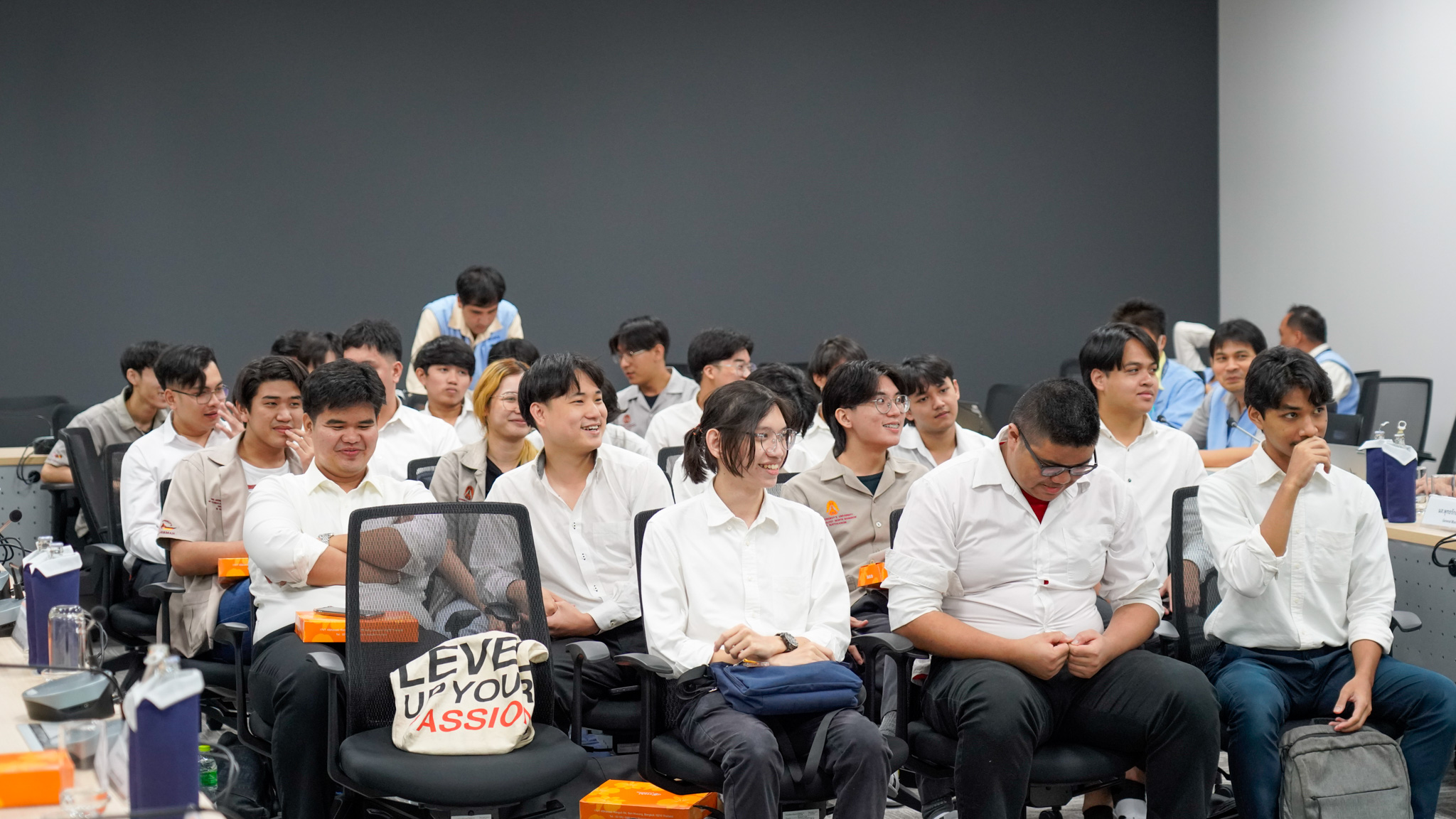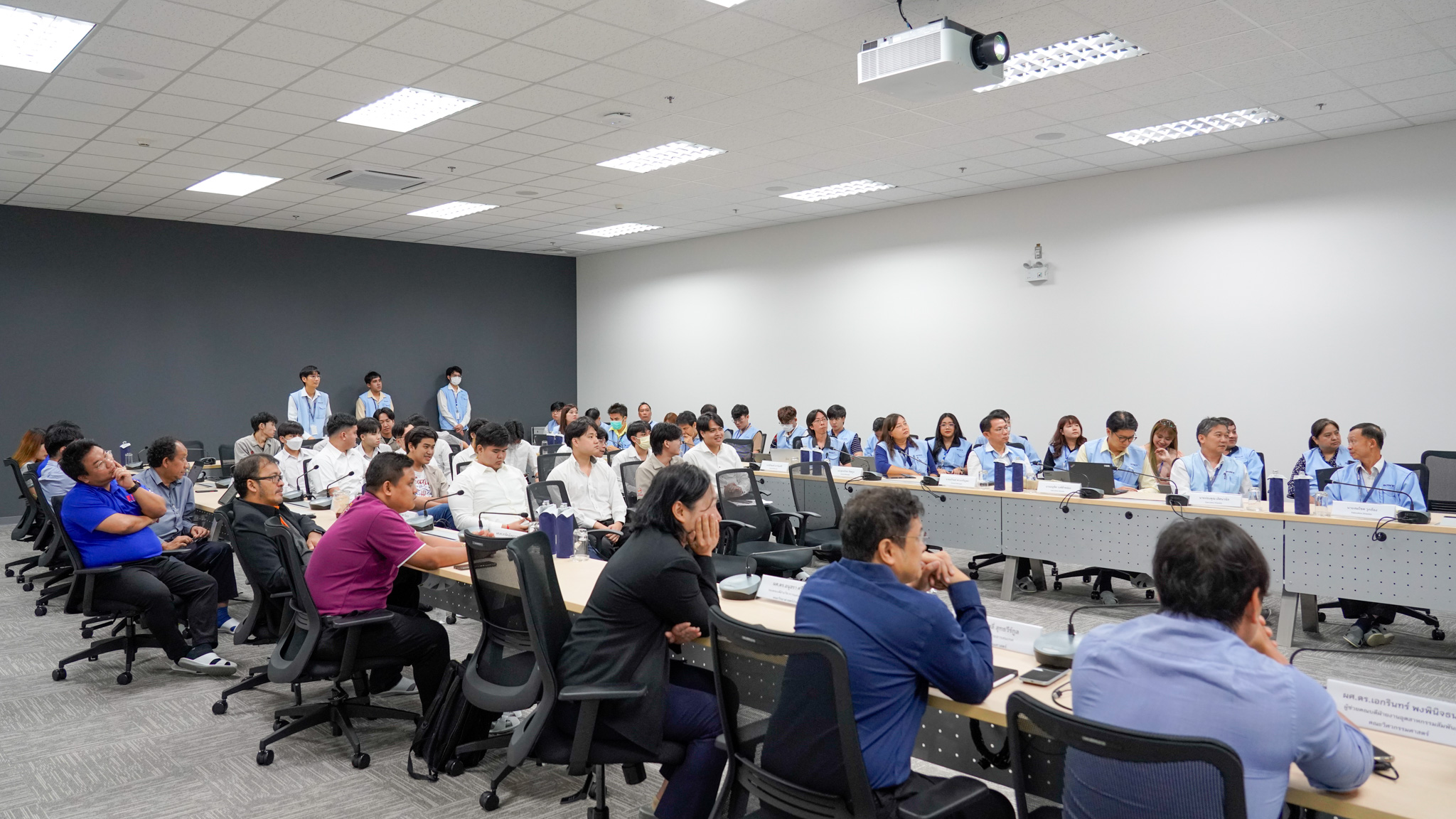 (ภาพ: คณาจารย์และนักศึกษาร่วมกันรับชมวิดีทัศน์เกี่ยวกับบริษัท)